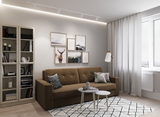 Спинка, выполненная в обивочной ткани, позволяет ставить диван в центре комнаты и зонировать пространство.