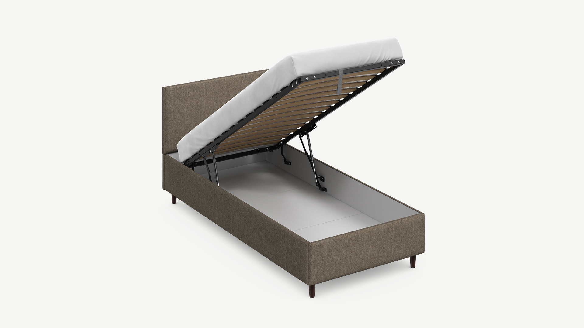 - Скрытая под основанием вместительная емкость без внутренних перегородок позволяет использовать всю площадь подкроватного пространства для хранения вещей.