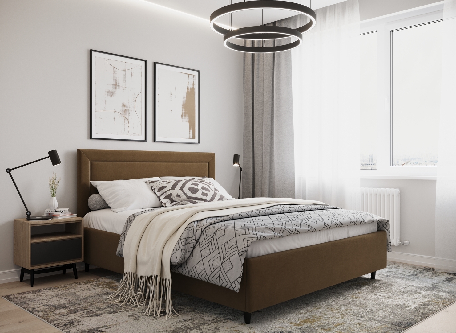 Создать гармоничный интерьер и завершить образ спальни помогут дополнительные аксессуары, например: тумбы, банкетки, подушки.