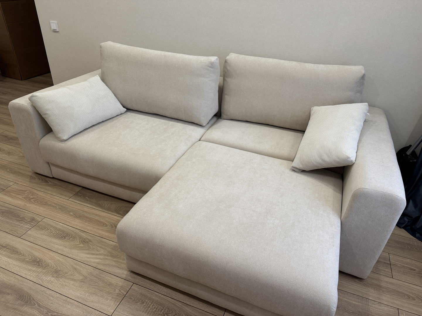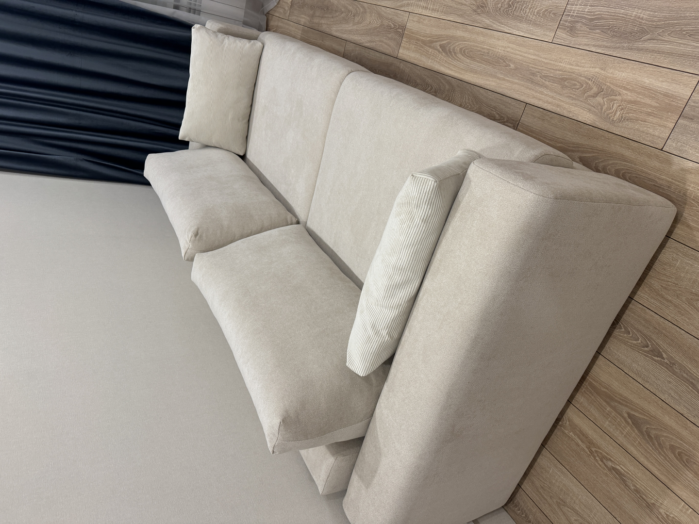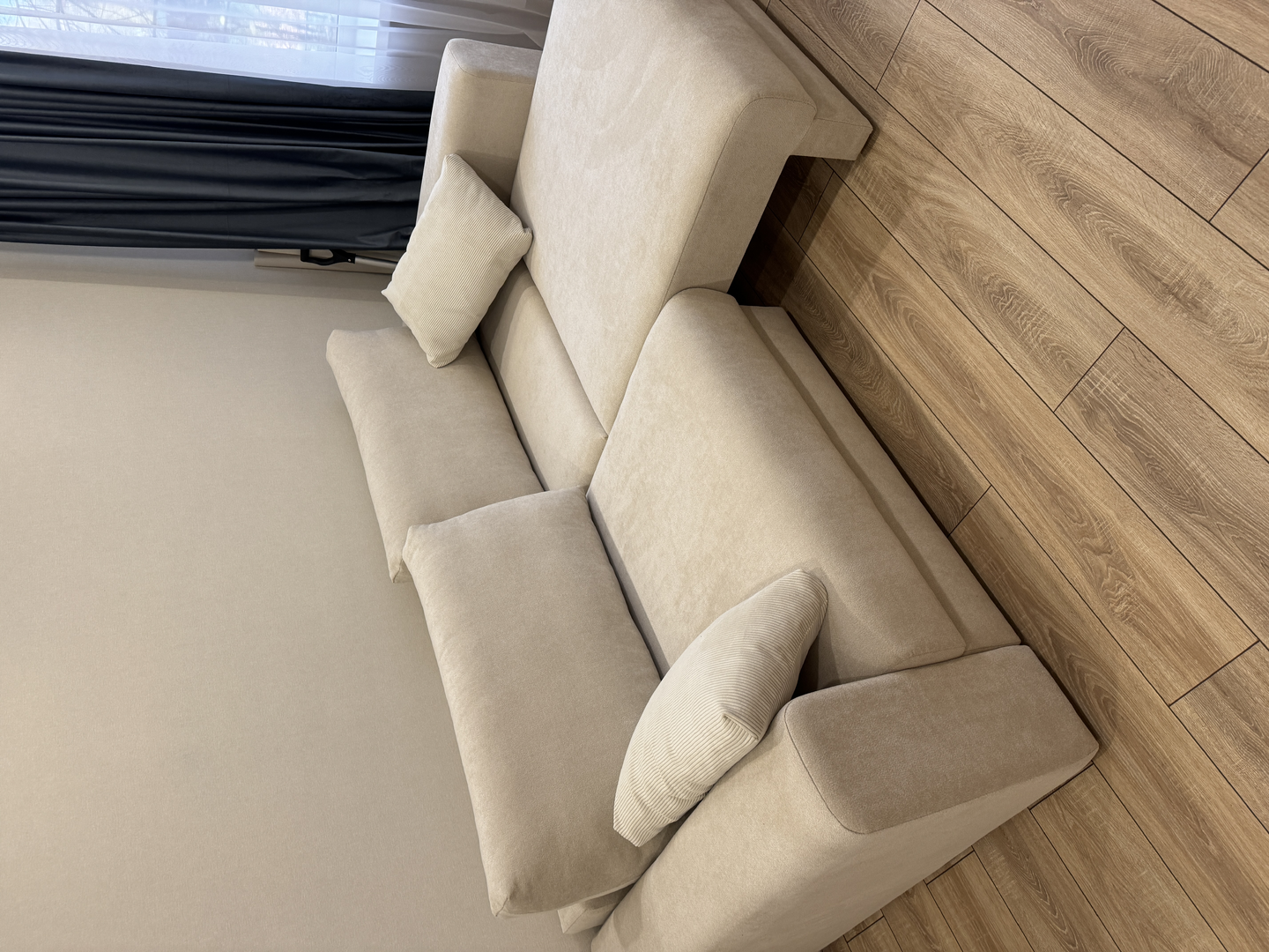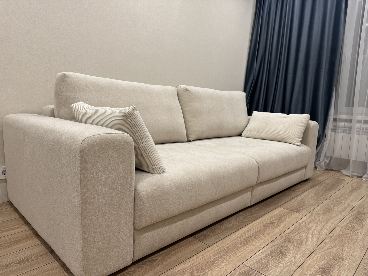 Диванчик очень приятный. Цвет и материал - восторг🫶🏻 При желании можно сделать угловым. Удобный, мягкий.