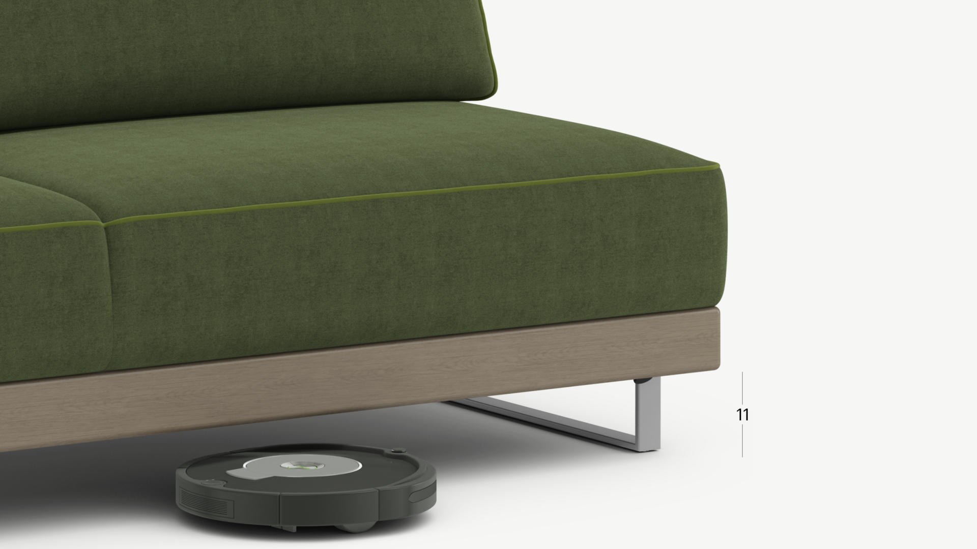 Благодаря высоким прямоугольным опорам под диваном проходит робот-пылесос и легко проводится влажная уборка, что обеспечивает чистоту и порядок в доме.