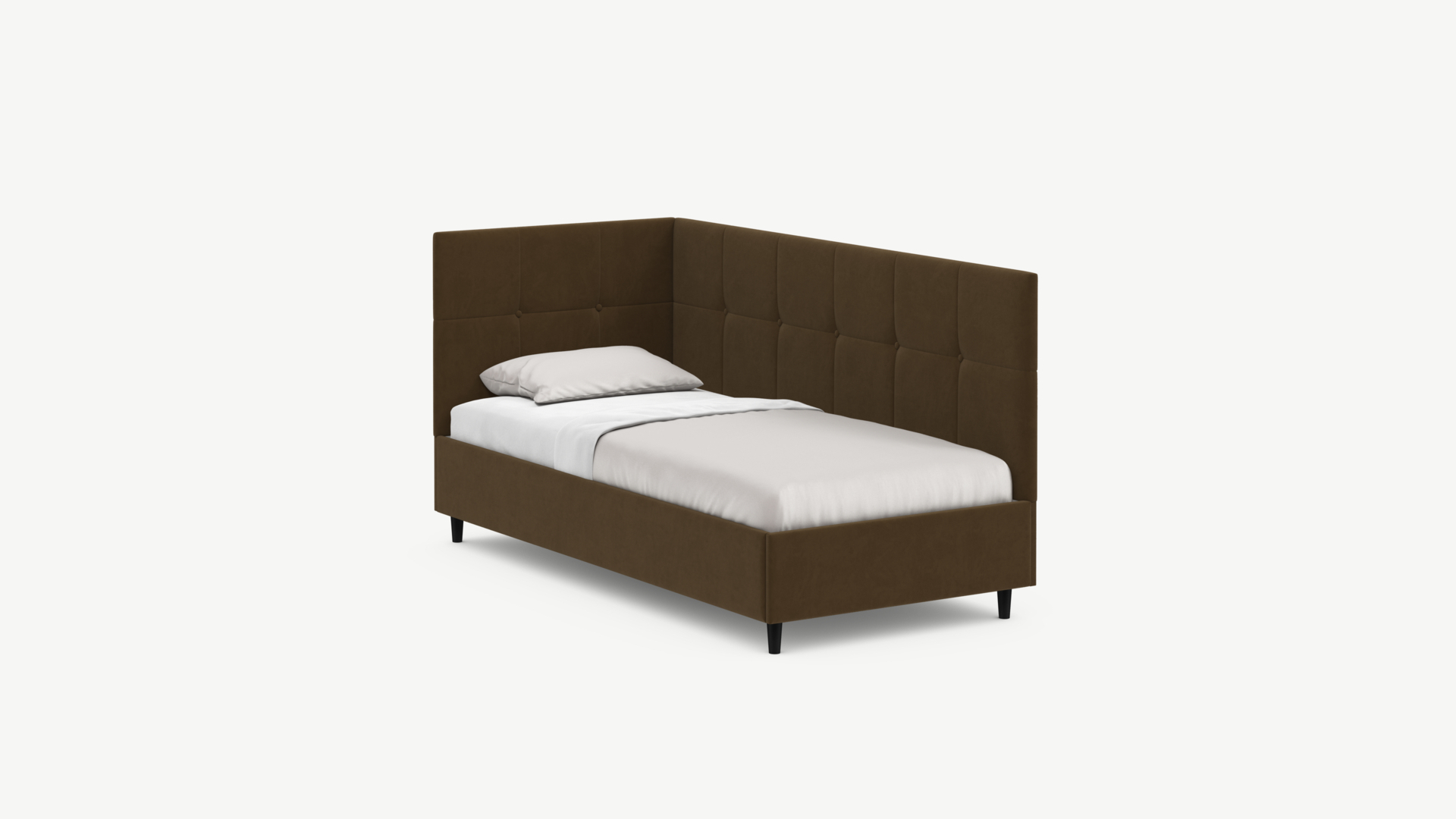 Угловая односпальная кровать MOON FAMILY 1261 с мягкой спинкой и изголовьем создаст в Вашей спальне ощущение уюта. Крупная квадратная стежка привносит в интерьер графических акцентов, а вставка из пуговиц наполняет пространство ощущением домашнего тепла.