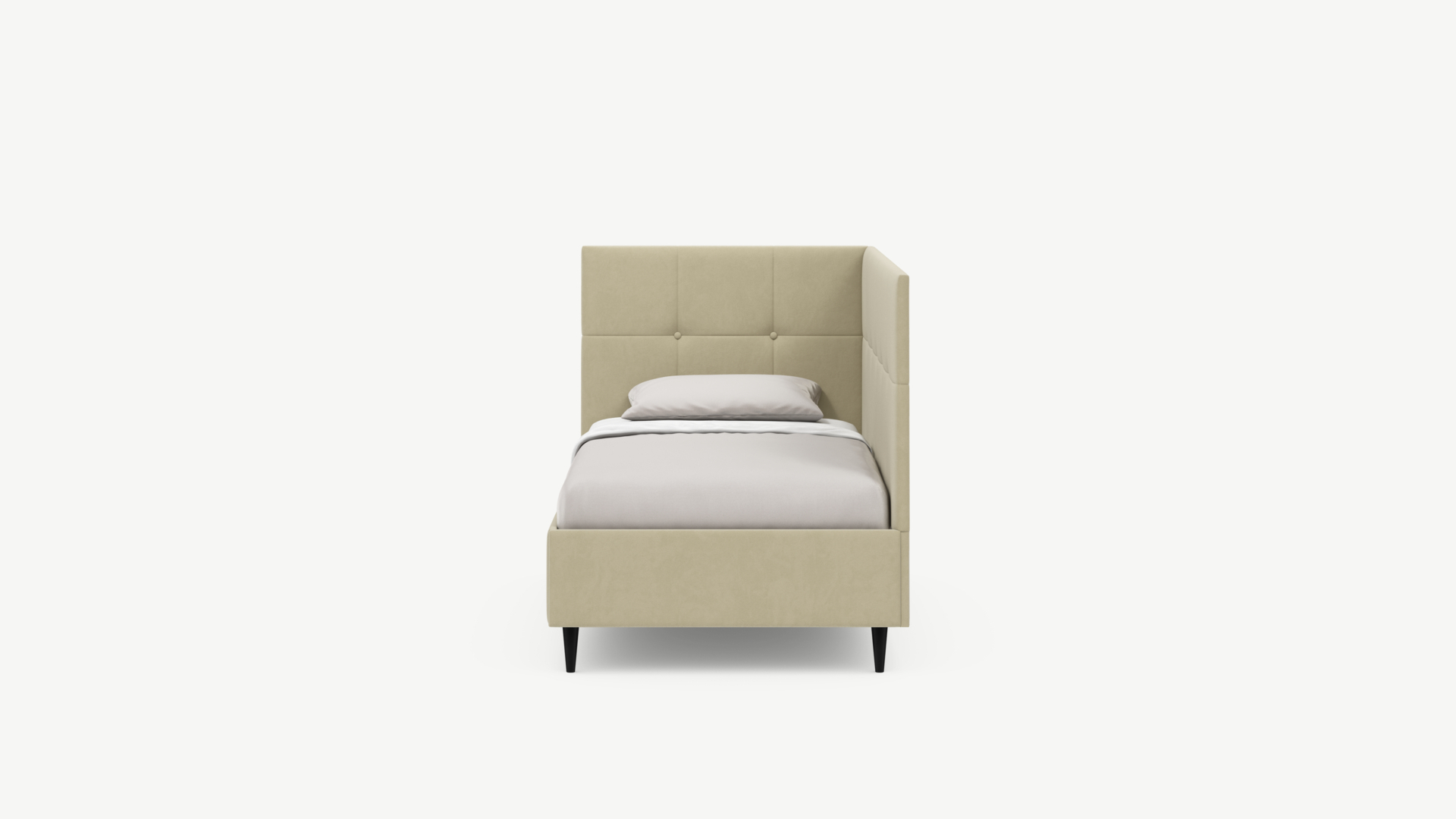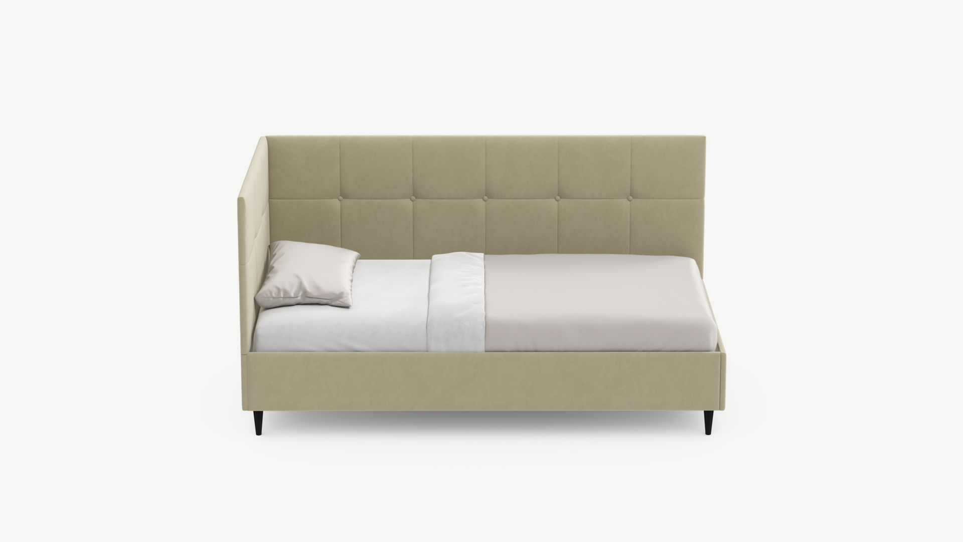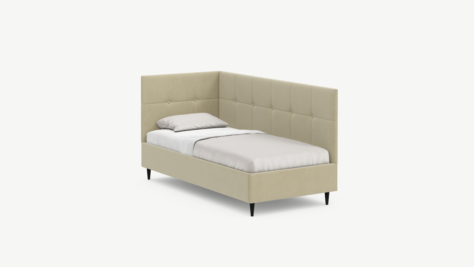 Угловая односпальная кровать MOON FAMILY 1261 с мягкой спинкой и изголовьем создаст в Вашей спальне ощущение уюта. Крупная квадратная стежка привносит в интерьер графических акцентов, а вставка из пуговиц наполняет пространство ощущением домашнего тепла.