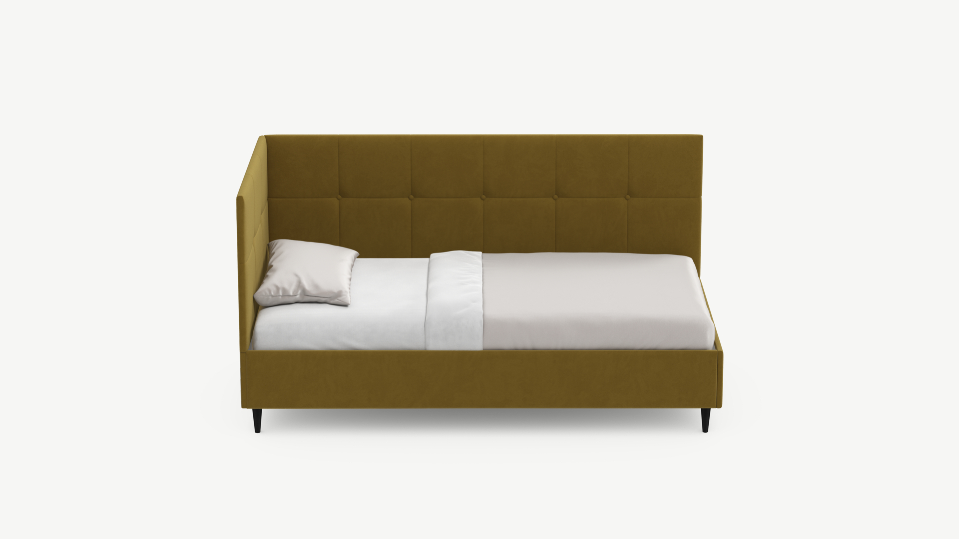 Угловая односпальная кровать MOON FAMILY 1261 с мягкой спинкой и изголовьем создаст в Вашей спальне ощущение уюта. Крупная квадратная стежка привносит в интерьер графических акцентов, а вставка из пуговиц наполняет пространство ощущением домашнего тепла.