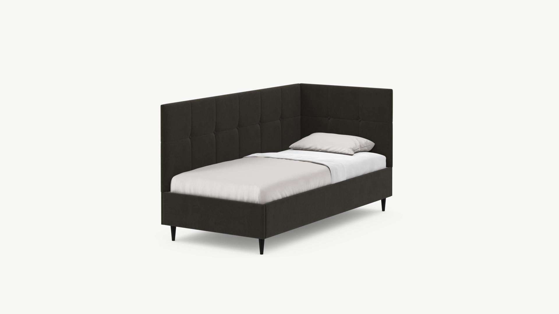 Угловая односпальная кровать MOON FAMILY 1261 с мягкой спинкой и изголовьем создаст в Вашей спальне ощущение уюта. Крупная квадратная стежка привносит в интерьер графических акцентов, а вставка из пуговиц наполняет пространство ощущением домашнего тепла.