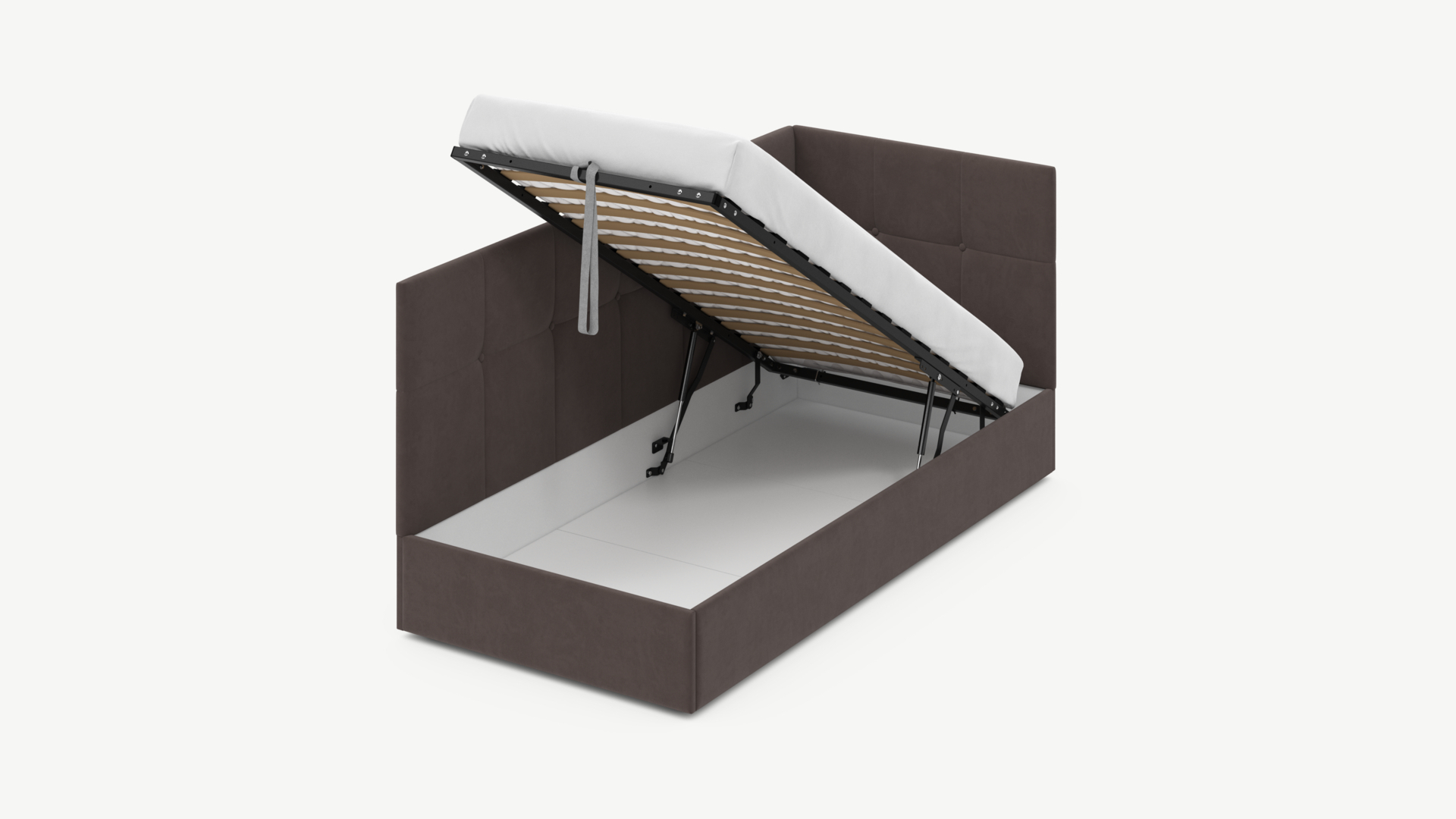 • Регулируемый подъемный механизм имеет два положения установки газовых амортизаторов в зависимости от веса матраса. Это дает возможность оптимально подстраивать угол подъема основания, а также плавно и бесшумно поднимать и опускать спальное место.