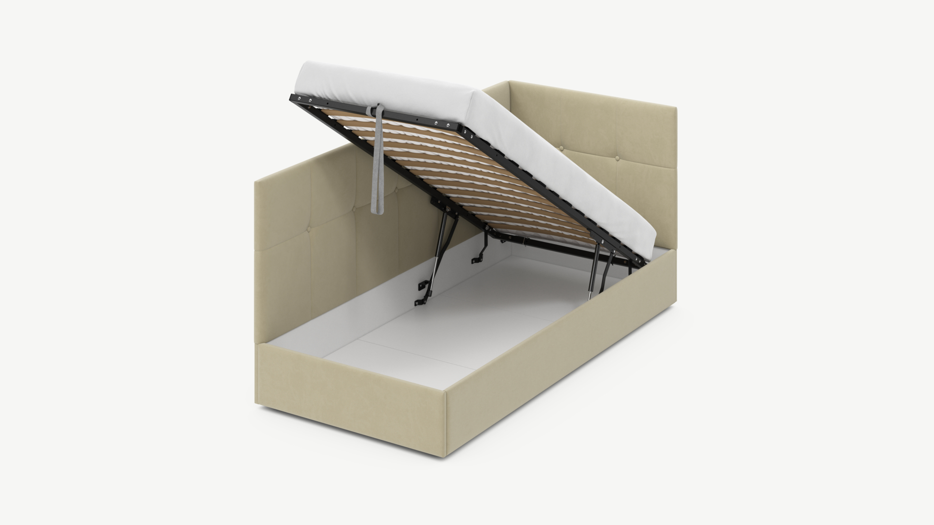 • Скрытая под основанием вместительная емкость без внутренних перегородок позволяет использовать всю площадь подкроватного пространства для хранения вещей.