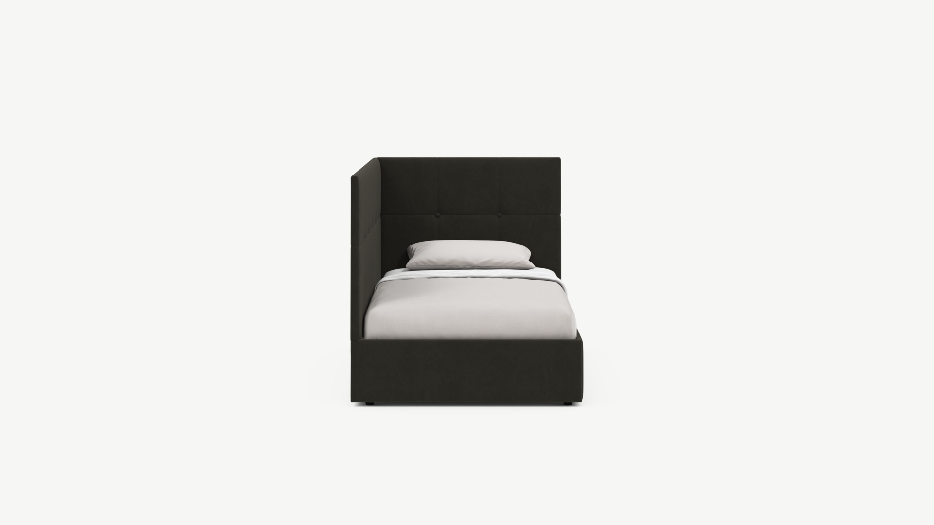 Угловая односпальная кровать MOON FAMILY 1261 с мягкой спинкой и изголовьем создаст в Вашей спальне ощущение уюта. Крупная квадратная стежка привносит в интерьер графических акцентов, а вставка из пуговиц наполняет пространство ощущением домашнего тепла.