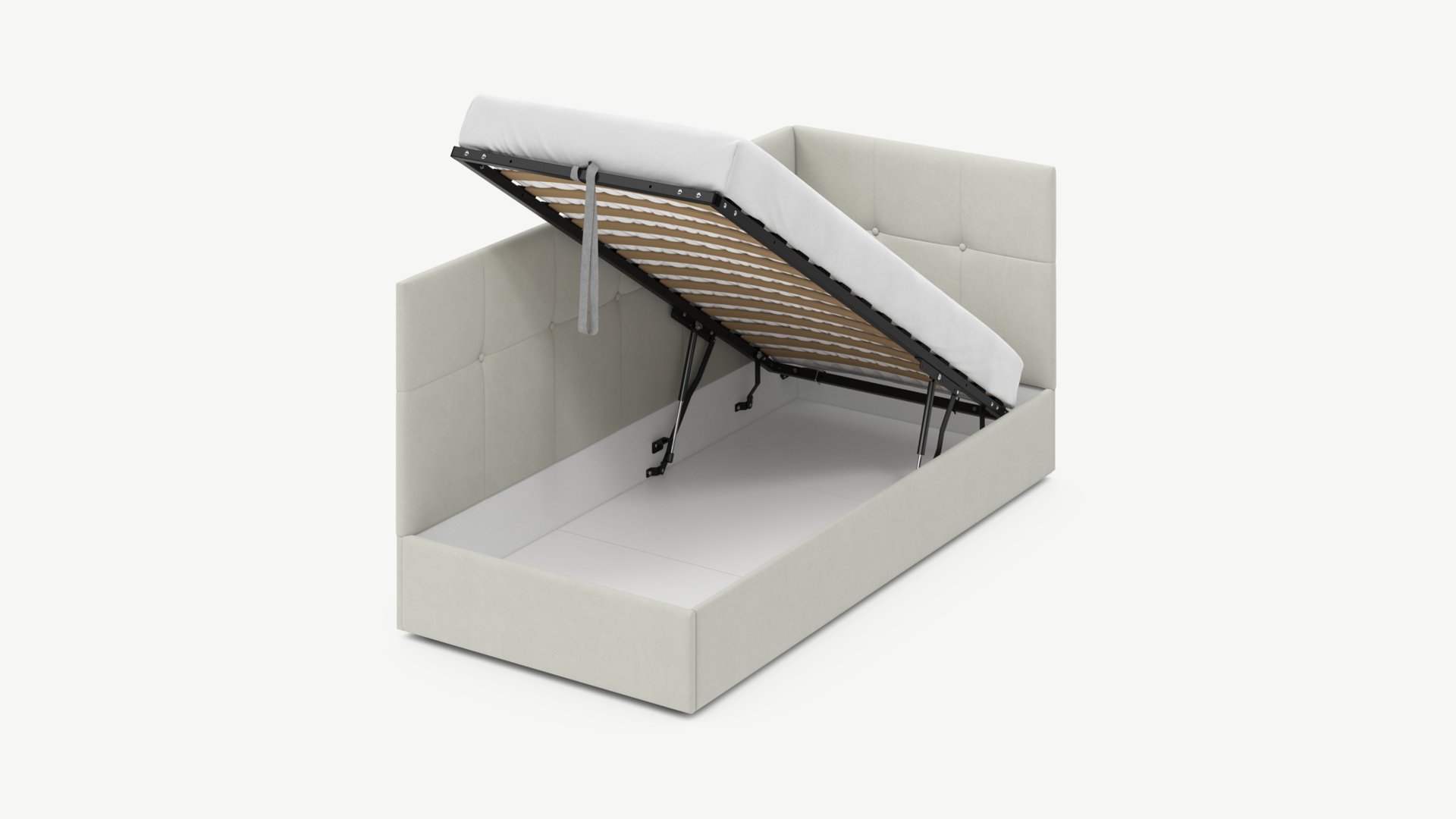 • Скрытая под основанием вместительная емкость без внутренних перегородок позволяет использовать всю площадь подкроватного пространства для хранения вещей.