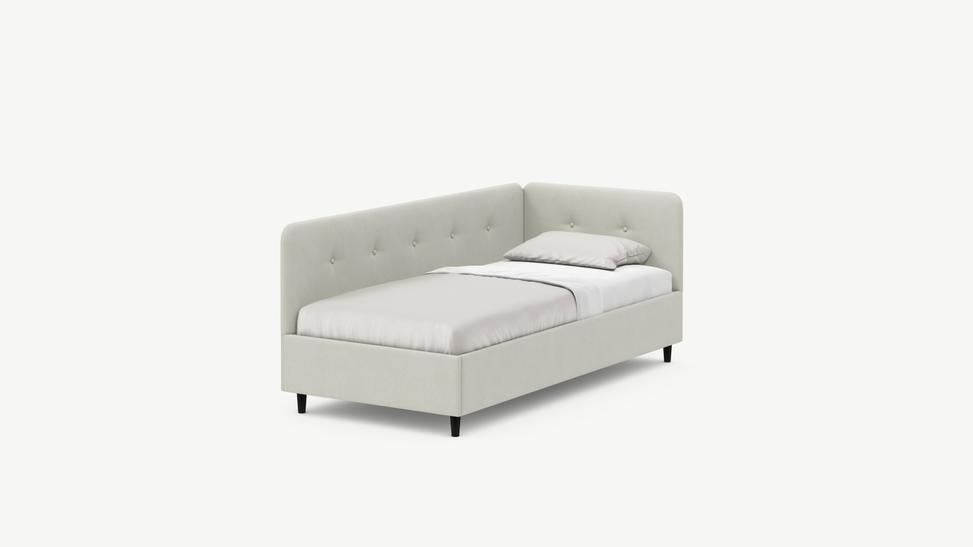 Угловая односпальная кровать MOON FAMILY 1253 с мягкой спинкой и изголовьем обладает округлыми формами, привносящими в интерьер нотки нежности. Изголовье, украшенное пуговицами, добавляет окружающему пространству шарм и уют. Высокие опоры придают кровати визуальной легкости, а также обеспечивают удобство во время уборки.