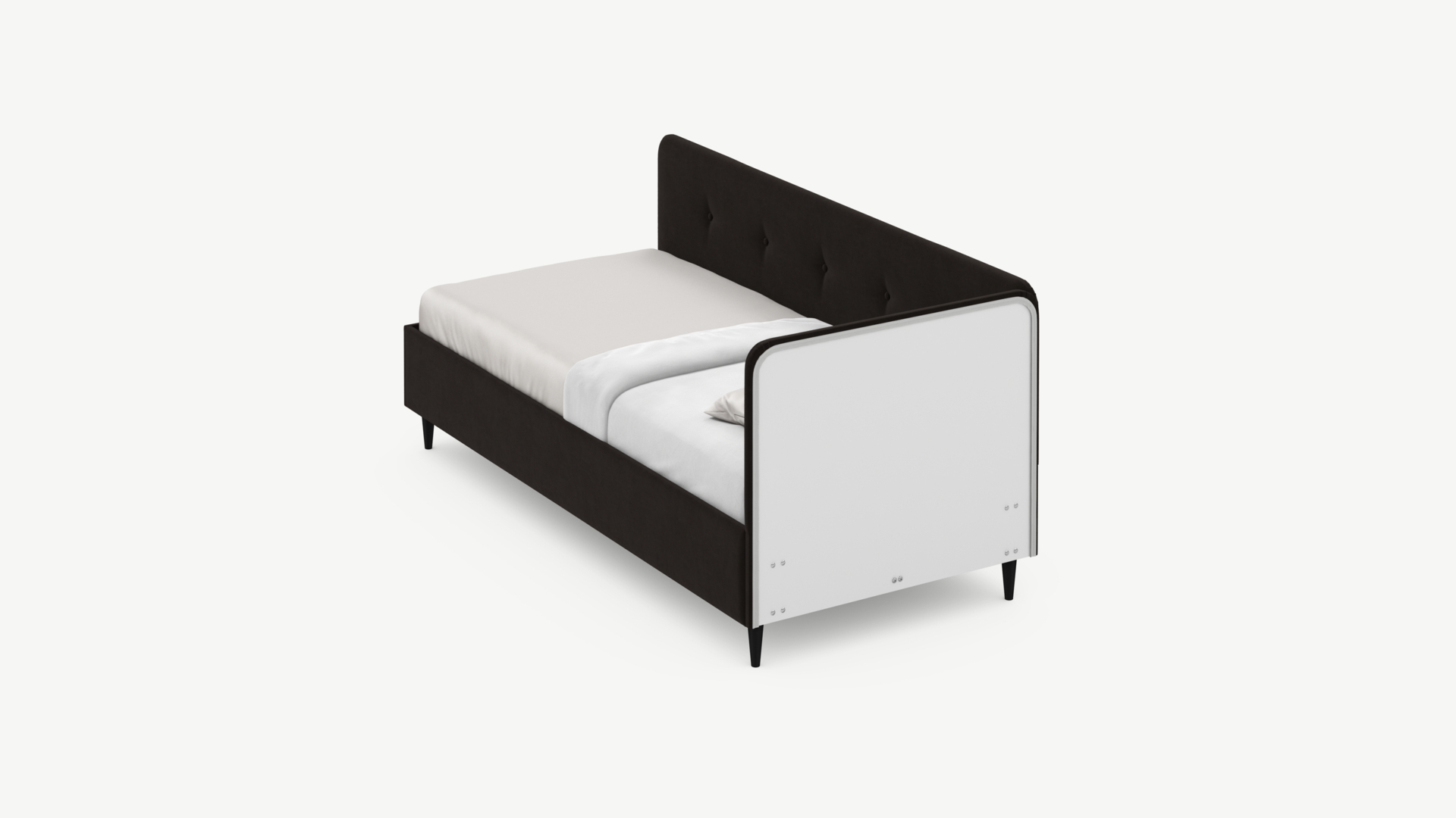 Угловая односпальная кровать MOON FAMILY 1253 с мягкой спинкой и изголовьем обладает округлыми формами, привносящими в интерьер нотки нежности. Изголовье, украшенное пуговицами, добавляет окружающему пространству шарм и уют. Высокие опоры придают кровати визуальной легкости, а также обеспечивают удобство во время уборки.