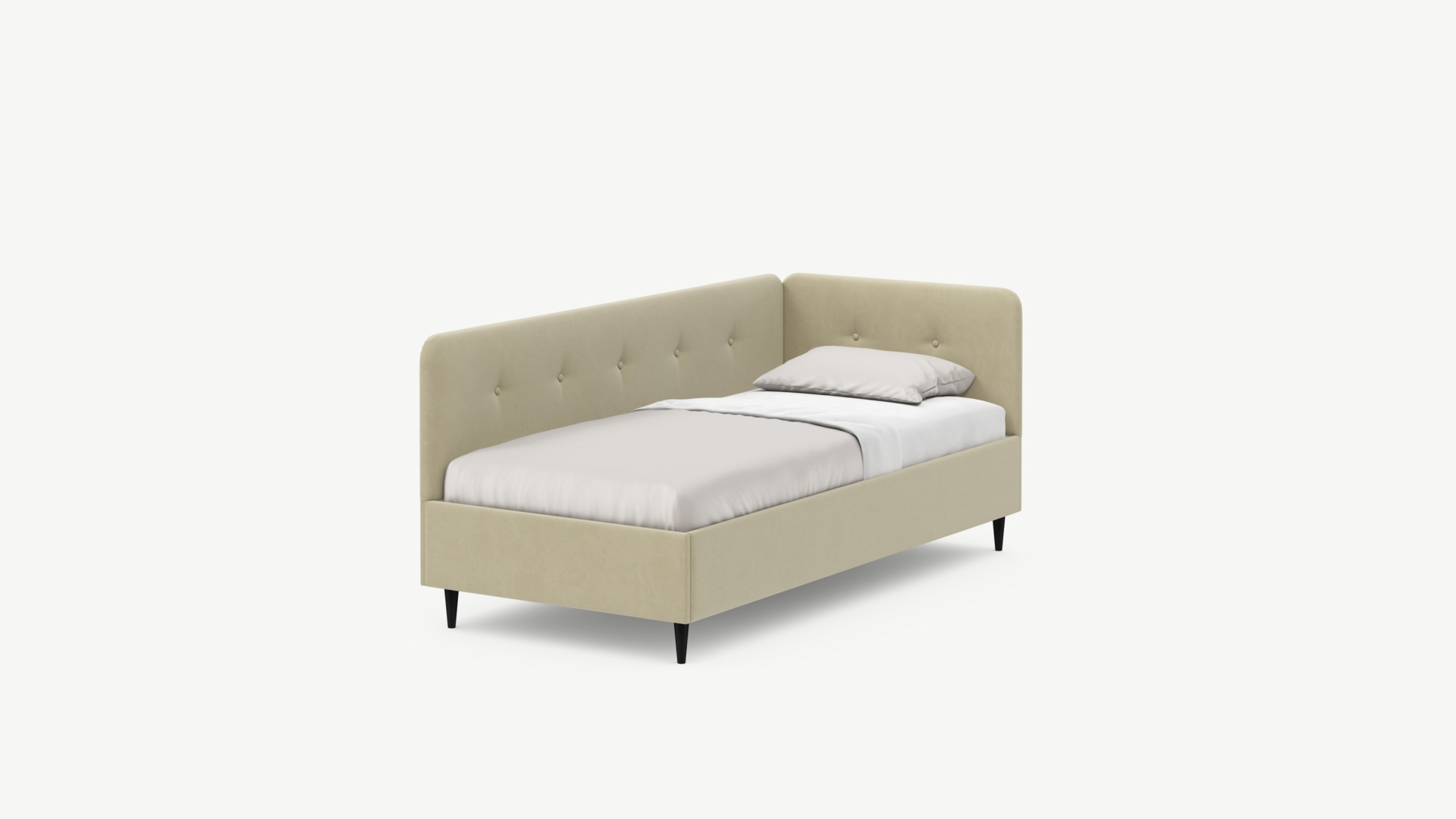 Угловая односпальная кровать MOON FAMILY 1253 с мягкой спинкой и изголовьем обладает округлыми формами, привносящими в интерьер нотки нежности. Изголовье, украшенное пуговицами, добавляет окружающему пространству шарм и уют. Высокие опоры придают кровати визуальной легкости, а также обеспечивают удобство во время уборки.