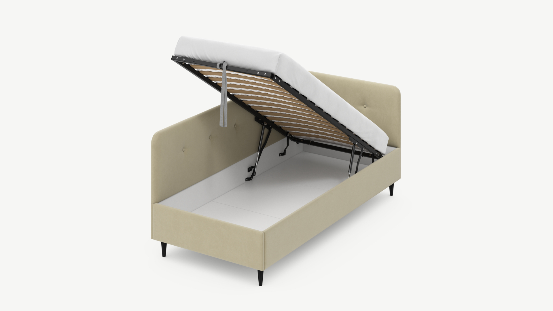 • Скрытая под основанием вместительная емкость без внутренних перегородок позволяет использовать всю площадь подкроватного пространства для хранения вещей.