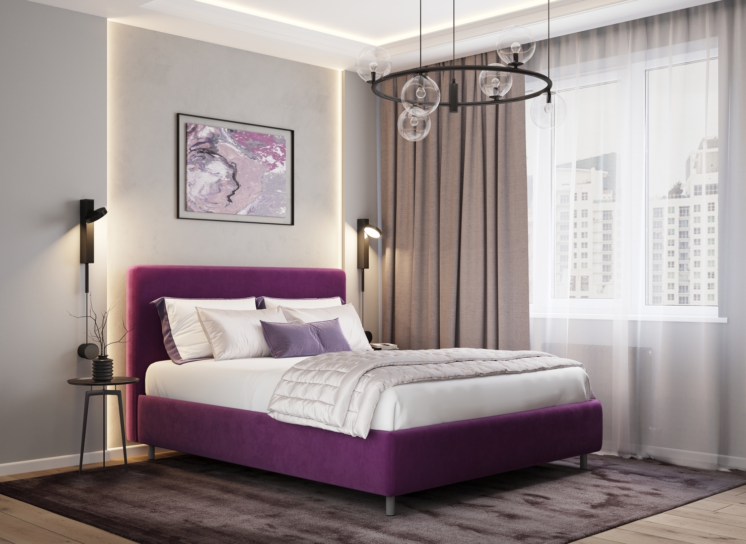 Творческий подход к выбору обивочного материала меняет образ дизайна. Велюр за счет своей бархатистой фактуры привносит в пространство шика и утонченности. Шенилл дополняет оформление спальни природными текстурами, создавая атмосферу тепла и уюта.