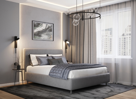 Творческий подход к выбору обивочного материала меняет образ дизайна. Велюр за счет своей бархатистой фактуры привносит в пространство шика и утонченности. Шенилл дополняет оформление спальни природными текстурами, создавая атмосферу тепла и уюта.