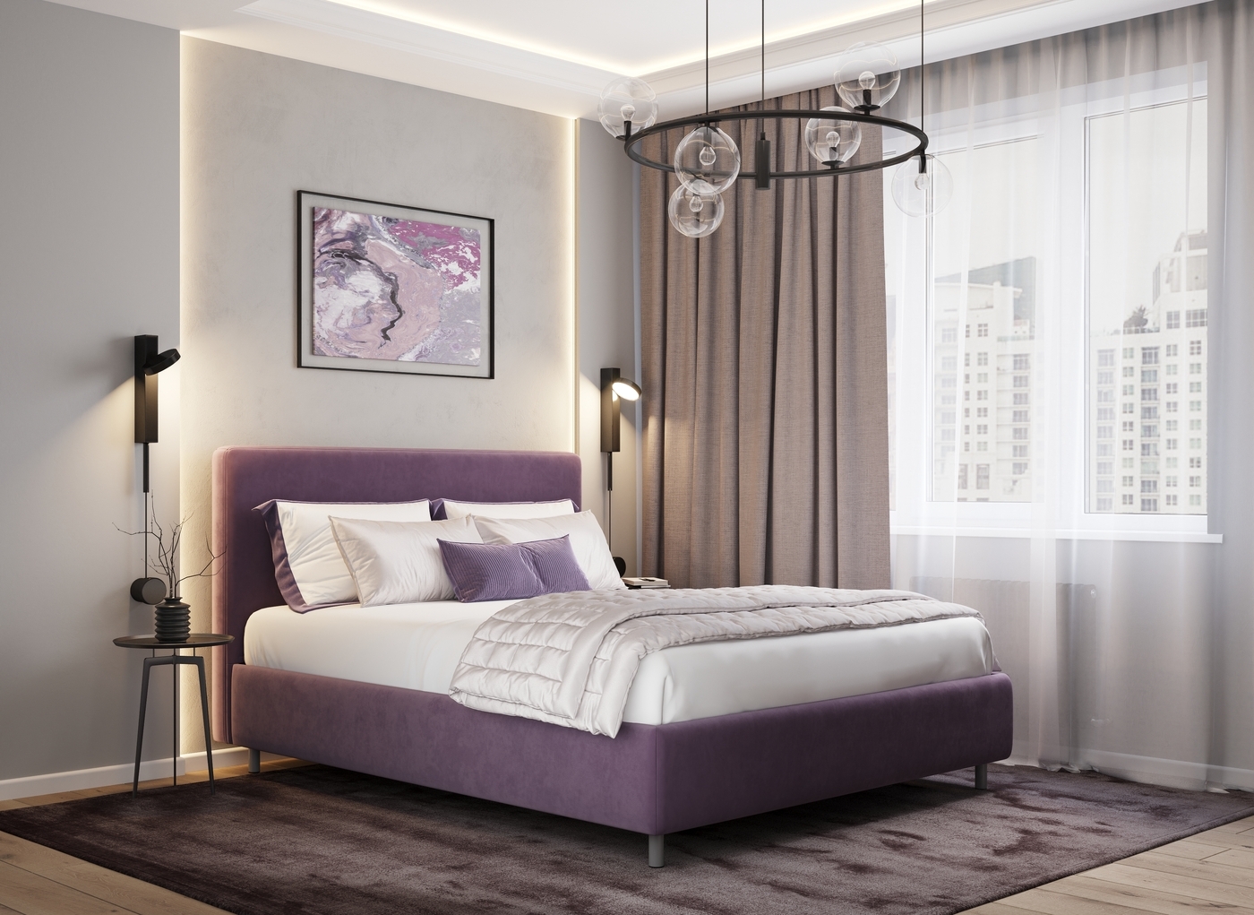 Творческий подход к выбору обивочного материала меняет образ дизайна. Велюр за счет своей бархатистой фактуры привносит в пространство шика и утонченности. Шенилл дополняет оформление спальни природными текстурами, создавая атмосферу тепла и уюта.