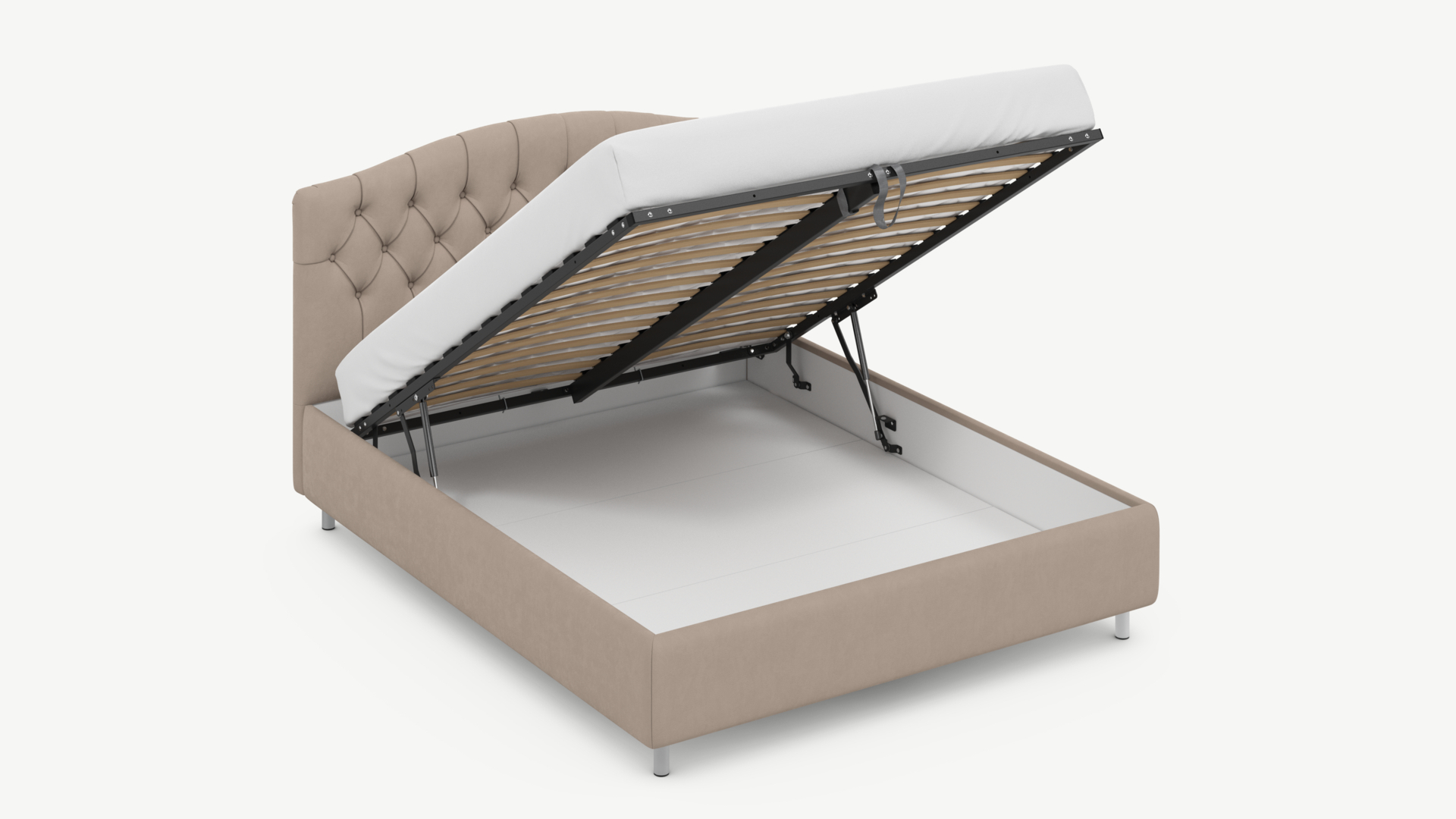 - Скрытая под основанием вместительная емкость без внутренних перегородок позволяет использовать всю площадь подкроватного пространства для хранения вещей.