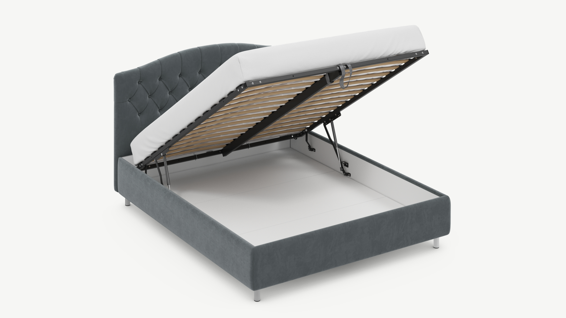 - Скрытая под основанием вместительная емкость без внутренних перегородок позволяет использовать всю площадь подкроватного пространства для хранения вещей.