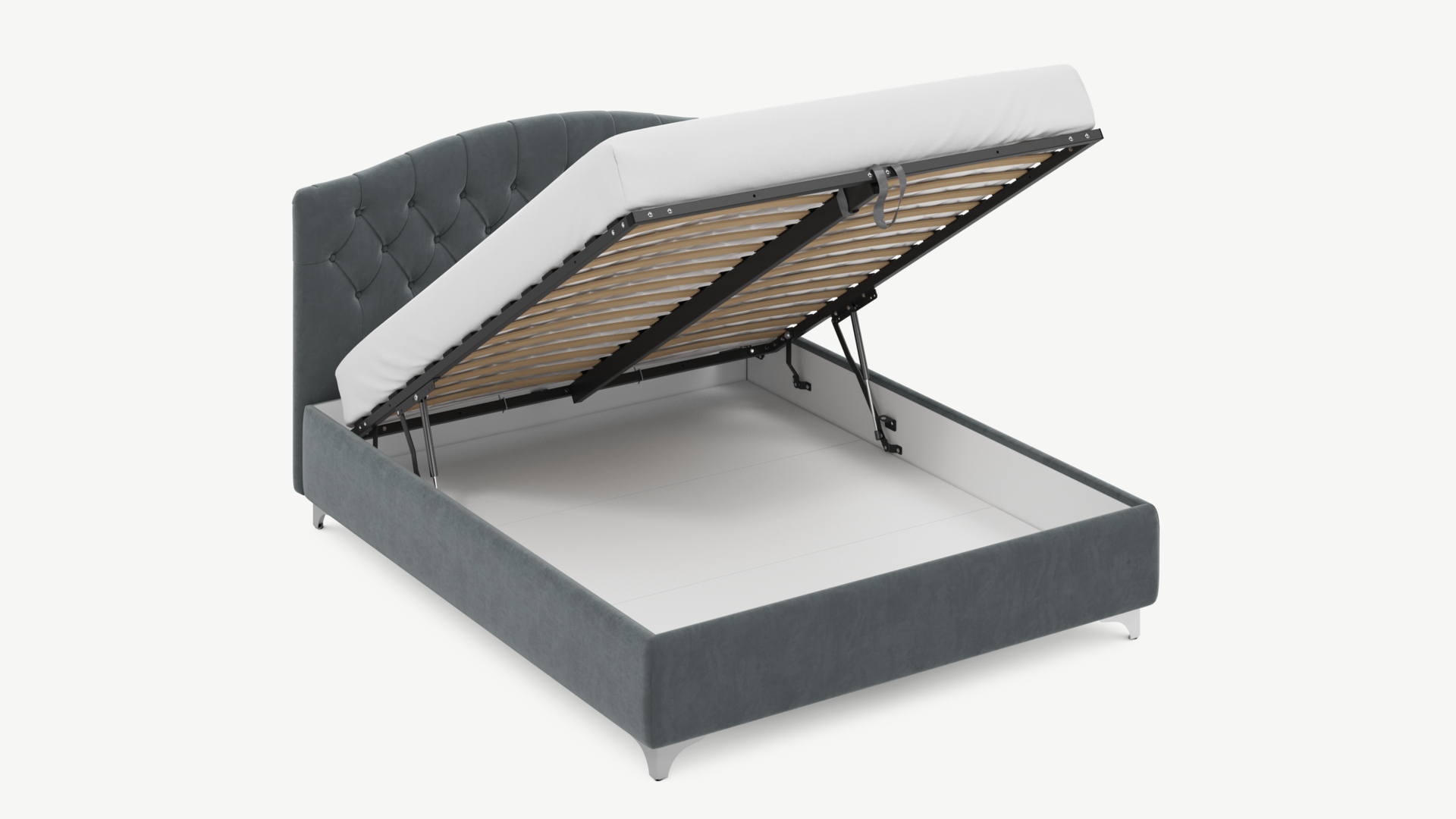 - Скрытая под основанием вместительная емкость без внутренних перегородок позволяет использовать всю площадь подкроватного пространства для хранения вещей.