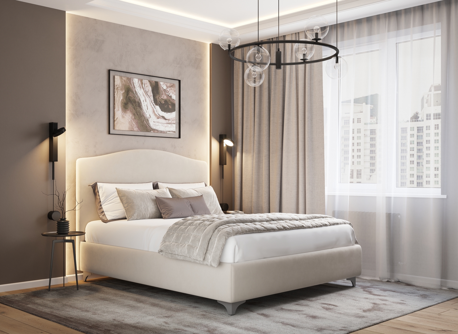 Разнообразие цветовой палитры позволит подобрать желаемый оттенок обивочного материала. Использование светлых цветов поддержит настроение стиля «Сканди». Нейтральные оттенки в цвет интерьера обыграют спальню в Современном стиле.